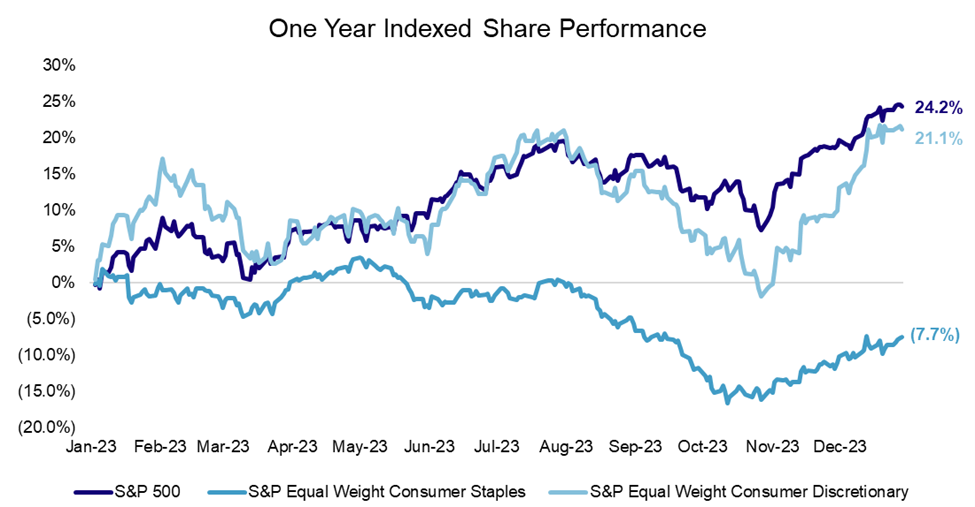 It’s “déjà vu all over again” as the sector remains focused on supply chain efficiency and SKU rationalization to enhance profitability. Discretionary spending has held up reasonably well despite a more cautious consumer, and, according to a McKinsey analysis, is expected to be largely unchanged over the next three months. As the chart below demonstrates, consumer discretionary equities tracked the broader market and significantly outperformed staples last year.