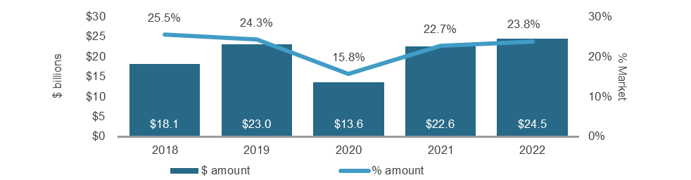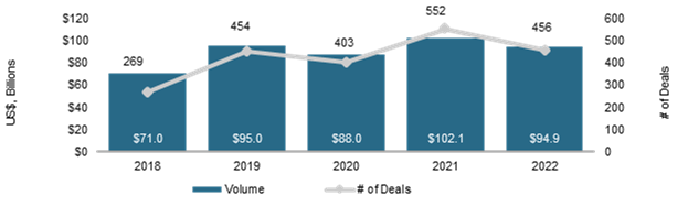 Despite global volatility, macro uncertainty and recessionary fears, the market remains open and is growing both new issuers and investors. While annual issuance volume was down modestly from a record 2021 (~$95 billion in 2022 vs ~$100 billion in 2021), the market did not shut down throughout the year. Consensus from market participants is that 2023 will be a strong year. Looking back, issuance volume has grown over 230% since the depths of the Global Financial Crisis to today. Moreover, even as global public markets waned, we continued to see diversified investors entering the market providing new sources of capital, negotiated terms and the ability to fund larger transactions than ever before.