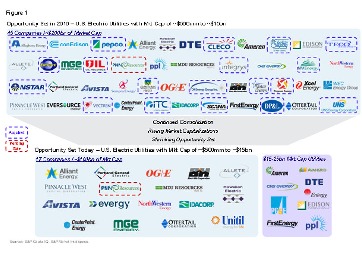Mind the (Valuation) Gap! Today, the valuation discrepancy is quite significant and has major implications on strategic direction and cost of capital, not to mention on end-user rates. In Figure 2 above, the valuation differential by investors' views on the prospects for individual utilities is readily evident with market cap on the “x-axis” and P/E ratio on the ‘y-axis.” The spread in valuation multiples is at historically wide levels.