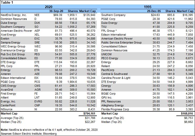 It’s Not Different This Time. Twenty-five years ago, there were 99 publicly-traded investor owned electric and combination utilities, with an average market cap of $2.652 billion. Today, there are 37, with an average market cap of $22.661 billion. The Top 25 then and now, is shown in Table 1.