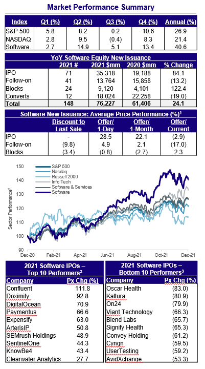 Even as a global pandemic has terrorized the global economy for almost two years, the Software sector has remained one of the best performing sectors during this time-frame. Benefitting from a low interest rate environment as well as a vast amount of businesses going through digital transformation (i.e. Work from Anywhere), software companies have taken advantage of the cheap liquidity in the issuance market as well as higher investor demand/valuations. Over the past two years, the S&P 500 Software Index has posted a ~102% increase. To put that into perspective, the S&P 500 has only increased ~48% while the Nasdaq has increased ~71% over the same time-frame. The growth in the sector has bolstered returns in the space – resulting in these companies entering the public market at all-time high valuations.