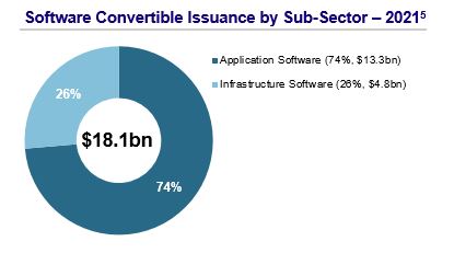 - Although software companies decreased their convertible issuance from 2020, a rising interest rate environment should continue to make the convertible bond an attractive product