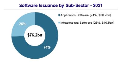 - In 2021, Software issuers raised just over $76bn, ~25% more than 2020’s proceeds. Software represented ~12% of total issuance, consistent with 2020, and dominated the TMT issuance as the sub-sector accounted for ~46% of total TMT issuance