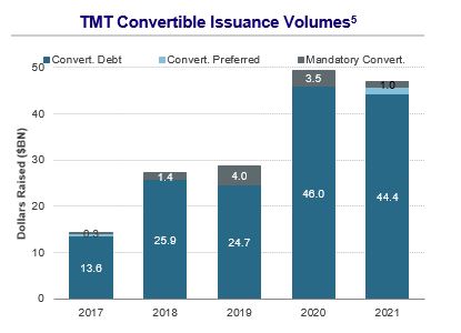 - Although TMT convertible issuance in 2021 did not meet last year’s record output, it still generated over $45bn of issuance resulting in the sector’s second most active year. Once again, software was the dominant subsector representing 39% of TMT issuance and 21% of all convertible issuance