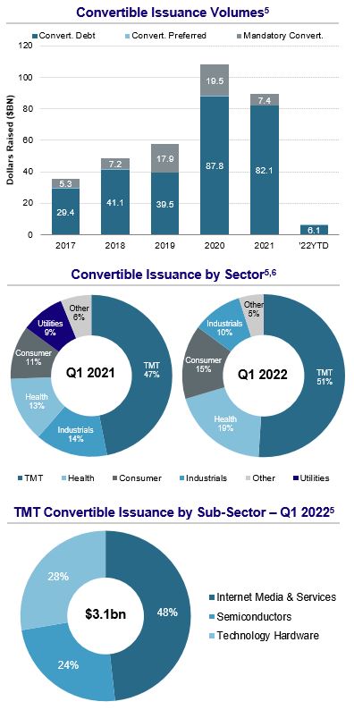 - In the 2021 TMT Year in Review, we noted “a rising interest rate environment should continue to make the convertible market an attractive product for issuers.” Although issuance has not been as abundant as some would think, we still believe the product is a strong alternative to selling common equity.