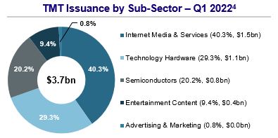 - In Q1 2022, TMT issuers raised ~$3.7bn, which amounted to ~7% of TMT’s Q1 2021 proceeds and ~12% of total issuance in Q1 2022.