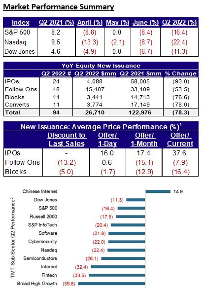 The issuance market continued its sluggish performance in Q2 2022 as several issuers, both private and public, stayed on the sidelines due to volatility and ambiguity in the market. As of quarter-end, the VIX was up 67% YTD - significantly above the issuance-friendly 10 - 20 range. Compared to Q2 2021, IPO proceeds were down a staggering 93%, while secondary proceeds (Follow-Ons and Converts) were down 65%.