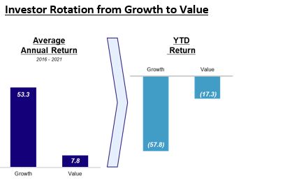 Within the TMT space, FinTech companies and High Broad Growth companies have suffered the most as both sectors are down (46%) and (56%) YTD, respectively. The market has seen a massive rotation from growth to value - the latter outperforming the former by 41% YTD.