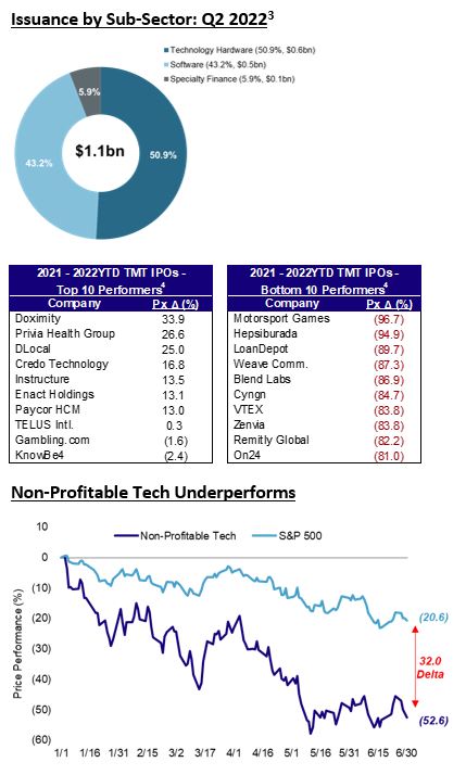 In Q2 2022, TMT issuers raised $1.1bn, which amounted to 3.0% of TMT issuers' proceeds in Q1 2022 and 4.1% of total issuance in Q2 2022.