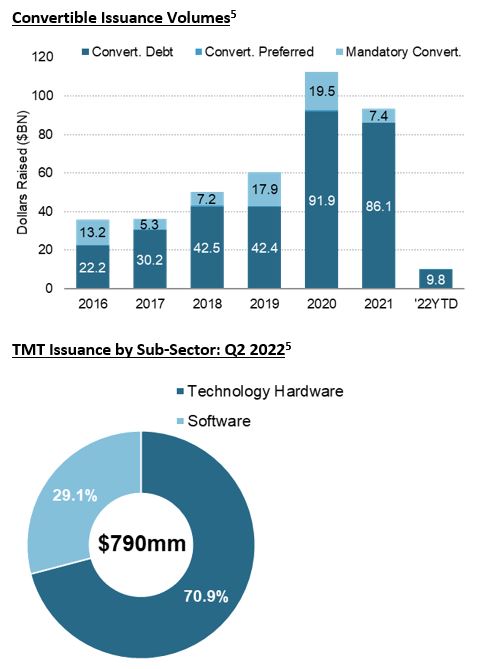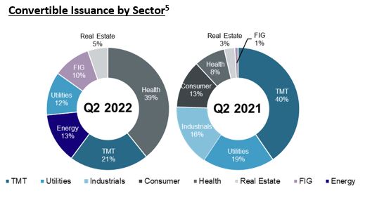 Convertible issuance in 2022 continued to lag relative to 2021 and 2020. Only 11 converts priced in Q2 2022 on U.S. exchanges generating $3.8bn in proceeds. This was 42% of total deals priced and only 22% of proceeds raised in Q2 2022.