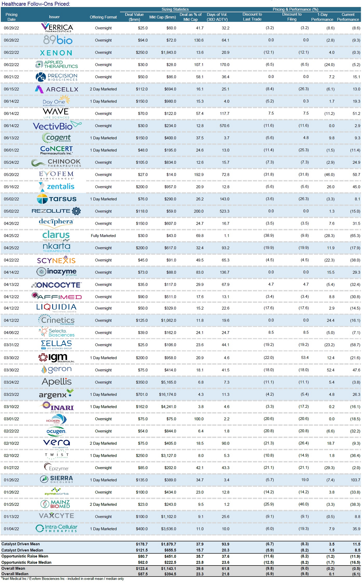 We saw 23 follow-on transactions in the 2nd quarter. I will highlight a subset but the themes are largely consistent with those of the first quarter. The majority are wall-crossed to ameliorate naked exposure to this tape. The high preponderance of pre-funded warrants signals the heavy dependence on existing investors. Many of the follow-ons were in keeping with Peter K’s advice above….discover your clearing price…raise…and move on.