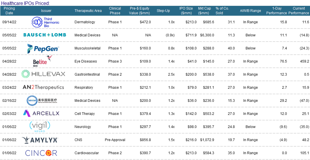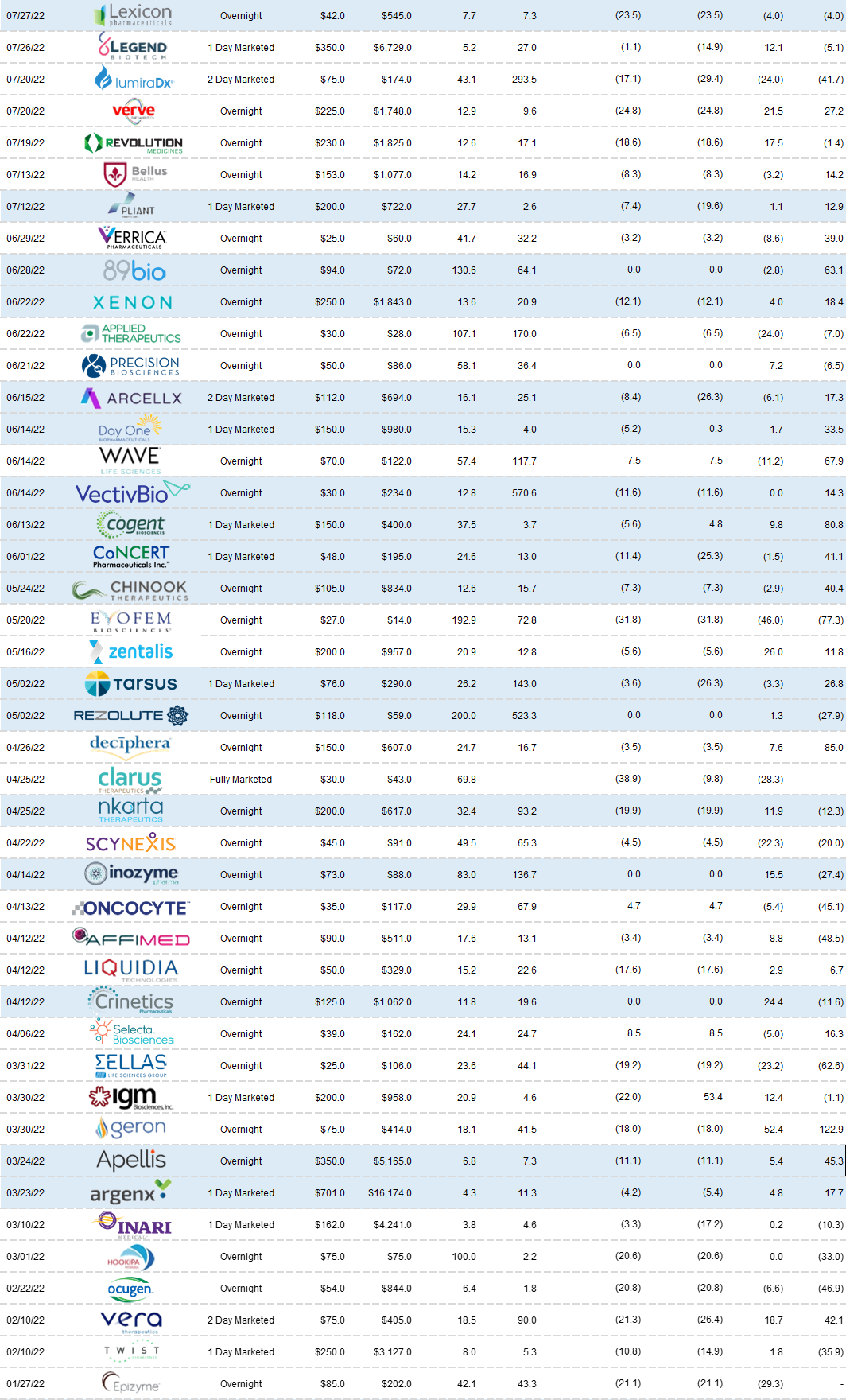 Pliant Therapeutics (PLRX) ripped higher (+159%) after posting stellar results from a clinical trial of its lung disease drug. On the back of this pop, the company was able to launch a $150m offering that was ultimately upsized to $200m. Given the strength of the results and the stock’s rally, Pliant was in a position to execute their capital raise without a wall cross (rare!). Some new investors did show up for this transaction – but it is important to note – that the new players only showed up after some element of de-risking – a sign of the times. The discount to last sale was only about 8%...a small concession to make given the meteoric rally.
