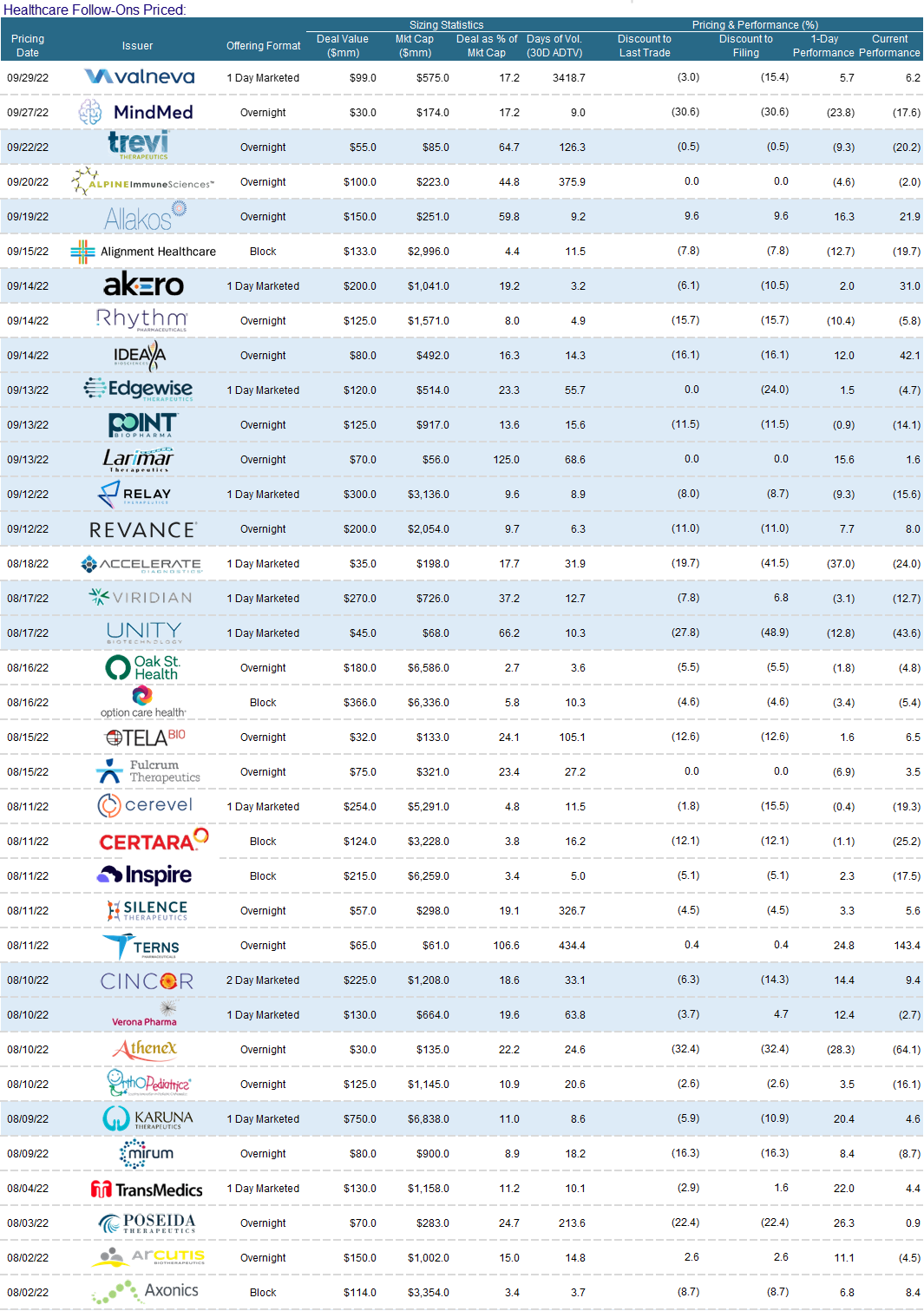Mirum Pharmaceuticals (MIRM) raised ~ $80m of new funding from an overnight stock sale after hitting a new 52-week high earlier this week. The offering was confidentially marketed and priced at the low end of the marketing range ($23 - $24) off a $27.49 close…a 16% file to offer discount. The biotech is cashing in on its post-Q2 gains to expand development of its drug Livmari, an FDA approved treatment for severe itching caused by a systemic liver disease.