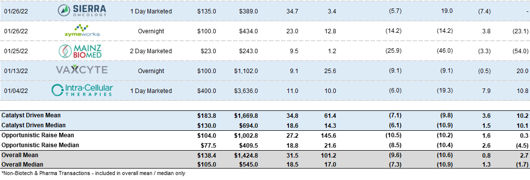 Unity Biotechnology (UBX) was able to raise 55% of their market cap after posting exceptional data for the DME – Diabetic Macular Edema – platform. They raised $45m after launching a $25m base deal – a significant upsize on the back of very strong demand. They did have to offer a fairly robust discount (28%) along with 100% warrant coverage. When considering the raise relative to market cap and the fact that they now have capital into 2024 – the ends justify the means. Mizuho was an active book runner on this transaction.