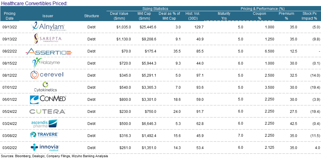 Alnylam Pharmaceuticals (ALNY) termed out floating-rate bank debt with a new $900m five-year CB, significantly reducing its borrowing costs. They marketed the CB for one day today at a coupon and conversion premium of 1.25%–1.75% and 30%–35%. They priced the bonds at a 1% coupon, through the aggressive end of 1.25%–1.75% coupon talk. They were also able to secure a 35% conversion premium, the high end of 30%–35% talk.
