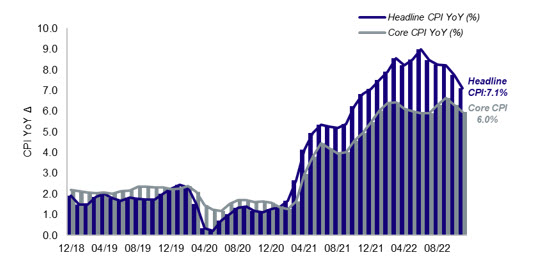 After reaching a high of 9.1% in June, the U.S. economy has seen CPI gradually fall back to December of 2021 levels. As of November 2022, headline CPI increased 7.1% YoY, while Core CPI increased 6.0% YoY. The Fed has explicitly told the market that once their 2% inflation target is achieved, they will start to consider a more dovish approach. Although inflationary pressures eased, companies have had to adjust not only their 2022 outlooks, but also their 2023 projections as higher input costs have cut into both top and bottom lines. At the same time, higher prices have started to cut into consumer spending habits as more and more Americans are dipping into their savings and spending on credit. As CPI tends to be a laggard, these pricing pressures are likely to continue to be reflected in 4Q22 earnings.