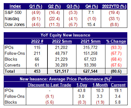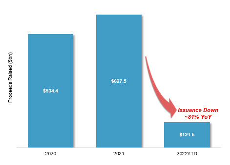 Due to uncertainty from a macro perspective and poor stock performance, the majority of public and private companies in 2022 avoided issuing equity as most did not think there was much economic benefit to raising equity proceeds. Investors also became more diligent in deploying capital as mounting losses in their portfolios made it difficult for them to add to their existing positions or invest in a new company altogether. As a result, particularly evident in the IPO market, profitable companies (or those with plans to be profitable in the near term) were the types of issuers raising proceeds in the market. This was significantly different from what investors found attractive in 2020 - 2021. Compared to 2021, IPO proceeds were down (93.3%), while secondary offerings (Follow-Ons, Blocks and Converts) were down (67.8%).