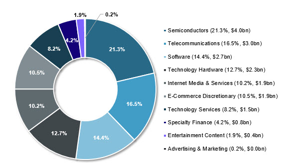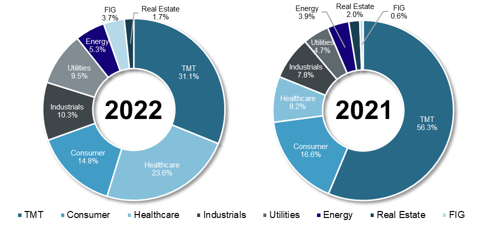 In 2022, TMT issuers raised $18.5bn, which amounted to 15% of overall issuance proceeds generated during the year. For perspective, this was only 2.9% and 9.7% of total issuance and total TMT issuance in 2021, respectively.