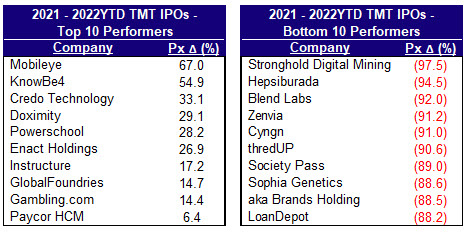 Although only a small subset of companies, the 2022 TMT IPOs (ex-China and Hong Kong) performed significantly better than their 2020 and 2021 counterparts. Despite the market volatility, they had an average and median return of 50.0% and (9.8%), respectively. For example, Mobileye (Nasdaq: MBLY), which went public in the end of October, finished the year 67.0% above its IPO price. This is in comparison to the TMT IPO Class of 2020 - 2021's collective average and median return of (43.2%) and (53.1%).