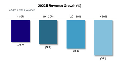 As we have noted previously in this report, the theme of profitability over growth will likely be a major focus going forward in 2023. From 2016 - 2021, growth stocks outperformed value stocks by 45.5%. After a decade-long bull market came to an end in 2022, investors quickly reversed course and deployed more capital into value stocks. As a result, value outperformed growth by 50.2% in 2022. This was also evident in the TMT sector as profitable companies traded at a 32.0% premium relative to non-profitable companies. From a revenue growth perspective, companies growing 30%+ underperformed companies growing less than 10% by (21.6%), largely due to their respective profitability profiles.