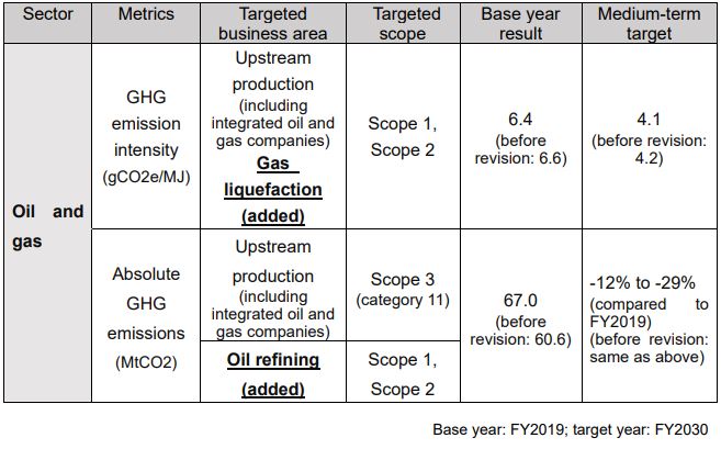 Our initial targets for the oil and gas sector were aimed at companies and projects whose primary business is in upstream production (including integrated oil and gas companies) (Scope 1 and 2 (development and mining) and Scope 3 category 11 (usage)). In the revision, companies and projects whose primary business is gas liquefaction and oil refining (Scope 1 and 2) are added to the target.