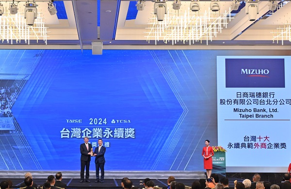 2024第十七屆TCSA台灣企業永續獎舉行頒獎典禮,本行榮獲台灣十大永續典範外商企業獎,是唯一獲獎的日商銀行。本行為推動永續所作的努力及在台灣取得的永續成效獲得肯定,自2022年以來連續3年榮獲台灣企業永續獎。
