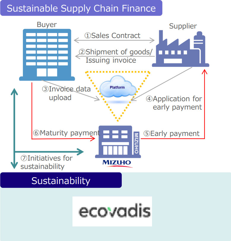 In terms of evaluating whether or not sustainability guidelines have been met, Mizuho Bank, Ltd. will use supplier’s ratings (sustainability performance) (*1) provided by EcoVadis, a French based professional sustainability rating agency, or other appropriate methods which Mizuho Bank, Ltd. deems appropriate. Mizuho Bank, Ltd. will provide financing to the suppliers on a supply chain platform which is globally operated and managed by Mizuho Bank, Ltd.