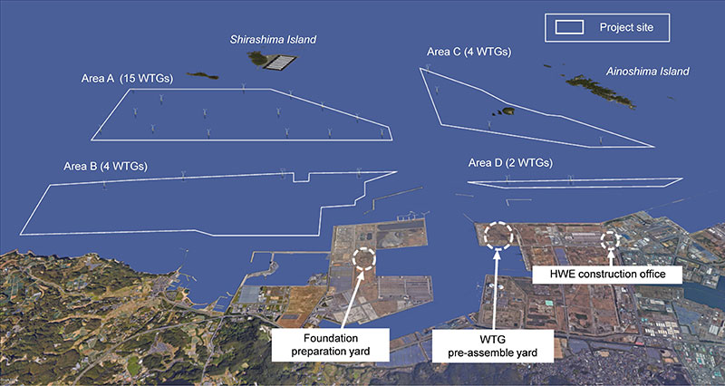 The project involves the construction and operation of 25 bottom–fixed offshore wind turbines in the Hibikinada area at the Port of Kitakyushu, Fukuoka, Japan, to supply zero–emission electricity for 20 years. 9.6MW class large–scale wind turbine generators will be installed for the first time in Japan. The 220MW wind farm capacity will be the largest in the country.