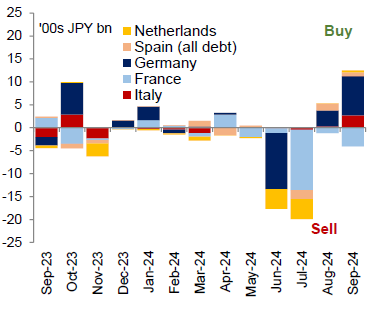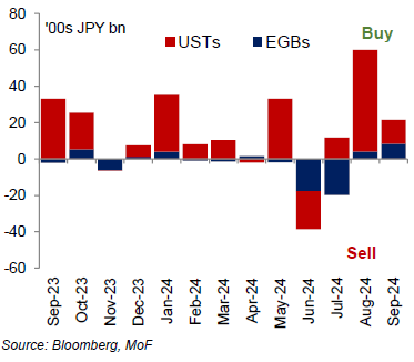 Firstly, we are starting to see a reduction in UST buying, while buying of (most) EGBs has picked up. This has been one of the key stories that the September MoF data tells. This move can be attributed to position-squaring in USTs ahead of the US election and increasingly attractive yields on EGBs (we’ll cover this point below). We suspect Japanese investors will start to be concerned about inflationary and issuance pressures in USTs.