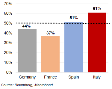 On the political front, Italy is also outperforming. The Italian government is currently the most stable out of the GE/FR/SP pack, with governing parties making up 61% of the Parliament. On the budget and fiscal policy, Italy has been working on reducing their debt burden following the EC’s EDP. Success relies on achieving above-estimate growth, which includes implementing the Recovery fund in a timely manner and ensuring stable macro conditions.