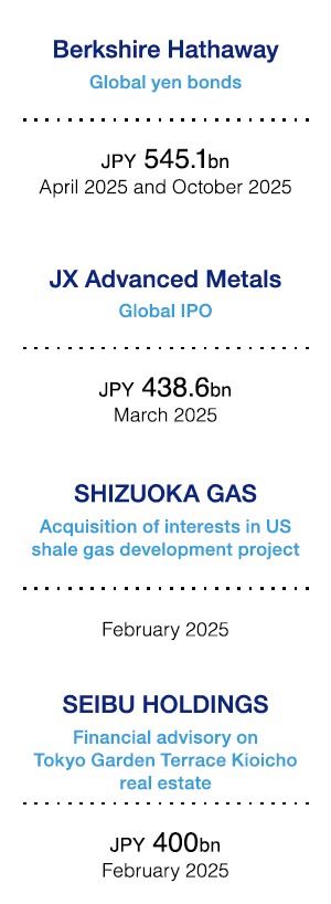 Our M&A advisory business leverages the latest insights and expertise to provide personalized advice tailored to each client's business strategy. We have achieved industry-leading results in Japan as well as a growing pipeline of cross-border deals in recent years thanks to our personalized global services in collaboration with Greenhill.