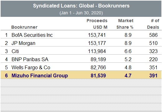 In the first six months of 2020, Mizuho Financial Group was the 6th ranked global loan bookrunner by proceeds. (Source: Refinitiv, Global Syndicated Loans Review)