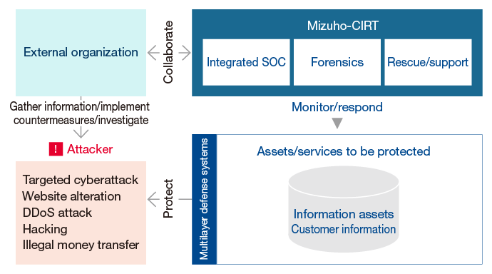 At Mizuho, to enable customers to make use of financial services feeling secured and contribute to stable operation and sustainable development of the financial infrastructure, we have positioned coping with cyberattacks as a top priority management issue. With Mizuho–CIRT1 taking the lead, we have assigned high–level professionals and are drawing on intelligence and cutting–edge technology developed in collaboration with external specialist organizations, while we are also taking initiatives to strengthen our strategic resilience capabilities. These include monitoring via integrated SOC2, analyzing computer viruses, developing multilayer defense systems, and other measures.