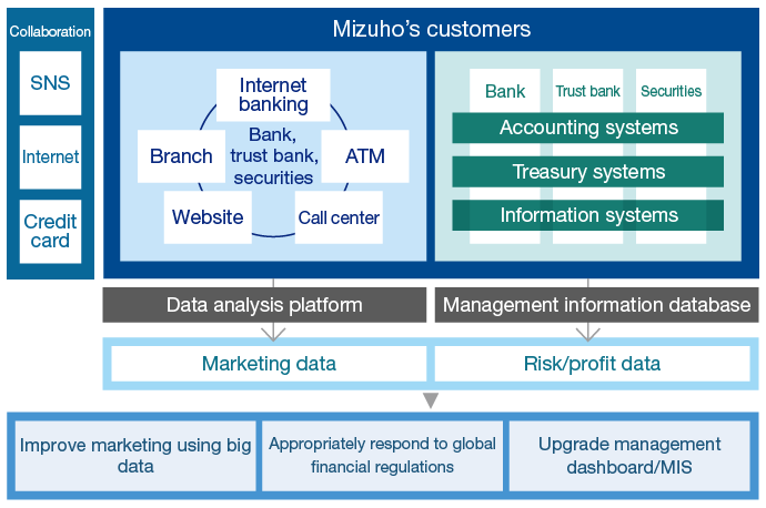 As data management for data collection and analysis to be used in management and business becomes more important to respond to global financial regulations and sophistication of MIS3, we have prepared a database to centralize management of collected and analyzed data relating to risks and profits, etc. In addition, with the aim of using big data for more sophisticated marketing, we are promoting the development of a data analysis platform that can process large volumes of data at high speeds.