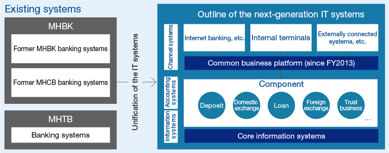 Regarding the next–generation IT systems, the highest priority is placed on ensuring quality and safe launching. Preparation will be carefully conducted after checking the system quality as it is critical to ensure safe and steady transition. The system migration will be implemented gradually, after thorough rehearsals. In the next–generation IT systems, as a result of unification of Mizuho's current three core banking systems, we will downsize and streamline our IT systems. Also, developing independent components by business and function will enable flexible adaption to new services and shorten the lead time and reduce costs for new development. By structuring cutting–edge core banking systems, we will strengthen infrastructure for providing services to our customers and improve operations processing speed.